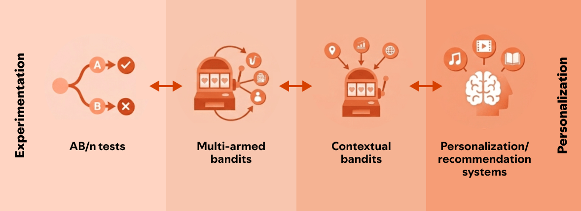 Figure 1: The progression from A/B testing to personalized recommendation systems through multi-armed and contextual bandits. (Image by the authors)